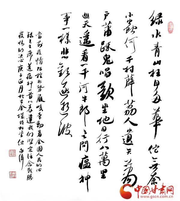 中國甘肅網(wǎng)2月12日訊(本網(wǎng)記者 張?zhí)m琴 張玉芳)2020年新春,面對突如其來的新冠肺炎疫情,全國人民正在以必勝的信心全力打贏這場沒有硝煙的戰(zhàn)爭。翰墨傳情,為抗疫助力。2月11日,由甘肅省文聯(lián)主辦,甘肅省文聯(lián)所屬文藝家協(xié)會、中國甘肅網(wǎng)承辦的甘肅文藝界戰(zhàn)“疫”主題作品展播活動正式啟動。我省12位書法大家揮毫潑墨,這些作品為所有奮戰(zhàn)在抗疫一線和防控疫情工作的平凡天使加油鼓勁,祈禱祝福,用文藝凝聚起抗擊疫情的強(qiáng)大精神力量,為我省防控疫情宣傳助力,受到了社會各界的贊譽(yù)。