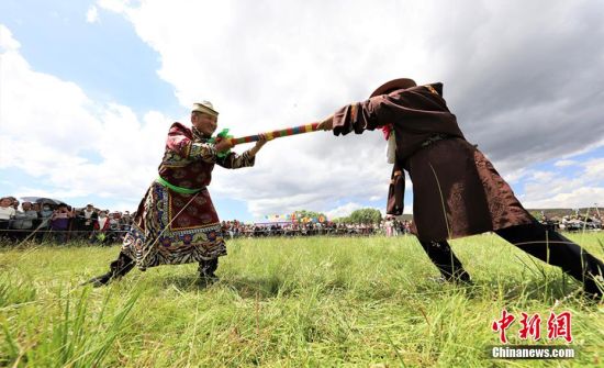 8月8日,甘肅張掖市肅南裕固族自治縣皇城鎮(zhèn)第十六屆民族文化旅游藝術(shù)節(jié)暨傳統(tǒng)體育運動會拉開帷幕。賽馬、押加、拔棍、頂杠子、射箭、背垛子等一項項少數(shù)民族傳統(tǒng)體育運動項目,吸引上萬觀眾觀看。近年來,肅南縣將體育項目與歷史、民族、文化、旅游有機(jī)結(jié)合,打造民族體育節(jié)慶品牌和運動會,使民族傳統(tǒng)體育發(fā)展增加了新的內(nèi)涵,逐步形成了全民健身品牌,影響力不斷擴(kuò)大。圖為參賽選手進(jìn)行拔棍項目比賽。 趙琳 攝