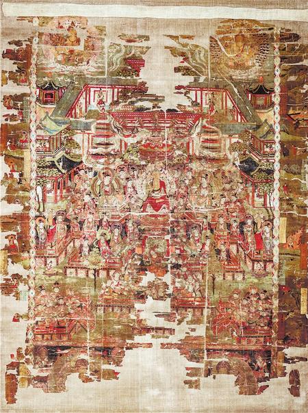 與西方凈土阿彌陀相應的是藥師如來的東方凈土,藥師信仰曾在敦煌地區(qū)極為流行。本圖可能是存世敦煌絹畫中最大的一幅,在構圖方面可與敦煌石窟壁畫中最復雜的凈土圖相媲美,是敦煌繪畫中十分罕見的超大型絹畫。