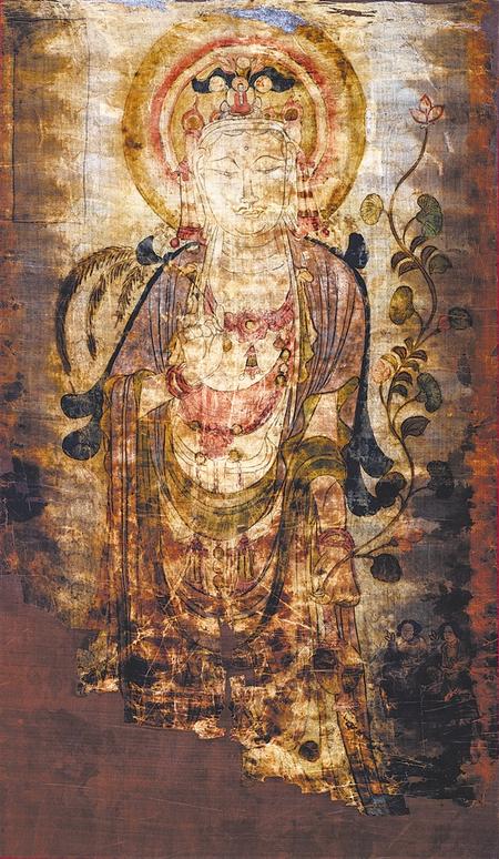 此像雖然褪色嚴重,殘缺不全,卻是敦煌絹畫中極為精美的佳作。觀音菩薩面朝前方,腰肢微扭,左肩前傾。面部輪廓清晰雅致,大耳垂肩,雙目微斂,神態(tài)慈悲安詳。右手持柳枝,左手提凈瓶,彎曲的長莖從瓶口伸出,蓮莖與觀音的站姿相呼應,搖曳向上在左肩上方開出一朵含苞紅蓮。畫面右下方跪有持蓮花女供養(yǎng)人像二身,她們衣著發(fā)型簡樸。其邊緣和畫面下部缺損嚴重,上部和兩側保存較完整,左上角長方形榜題呈空白。整幅畫面造型柔美繁復、勾勒緊勁嚴謹,衣帶翻轉飄舞,線條行云流水,疏密有致,加之斑斕的色彩,令畫面熠熠生輝。