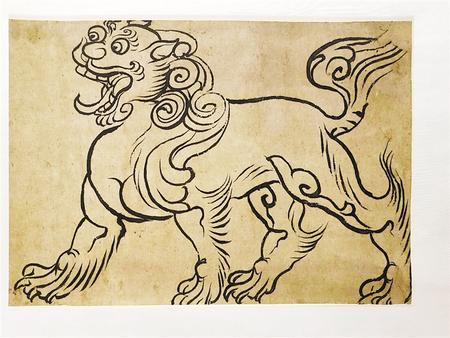 中國本無獅子,原產地是非洲和南美洲,約在漢武帝時才經西域傳入。獅子作為進獻的禮物,是敦煌壁畫中最早出現(xiàn)的動物形象之一。由于它的勇猛威儀備受佛教推崇,故在造像和壁畫中曾出現(xiàn)大量的獅子元素。除此,獅子形象還被吸納成為陵墓裝飾和傳統(tǒng)建筑的基本元素。這幅紙本畫,造型準確、健壯飽滿,昂首闊步、氣宇軒昂,線條遒勁、中鋒用筆,彈性十足,顯示出畫家嫻熟的造型功底,長短弧線勾勒卷毛,寥寥數(shù)筆,卻靈動活潑、灑脫不羈,為不可多得之線描精品。