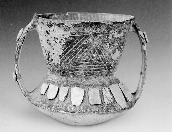 另一件人形三角折帶紋雙足罐,單耳,夾沙紅陶質(zhì)地,高約11厘米,圓鼓的肚子,身著黑色帶狀紋、豎條紋和“Z”字形紋的華麗衣衫,足穿一雙平底大鞋,鞋頭尖而深,似乎是一個孕婦形象。這可能是3700年前女性著裝的樣式。