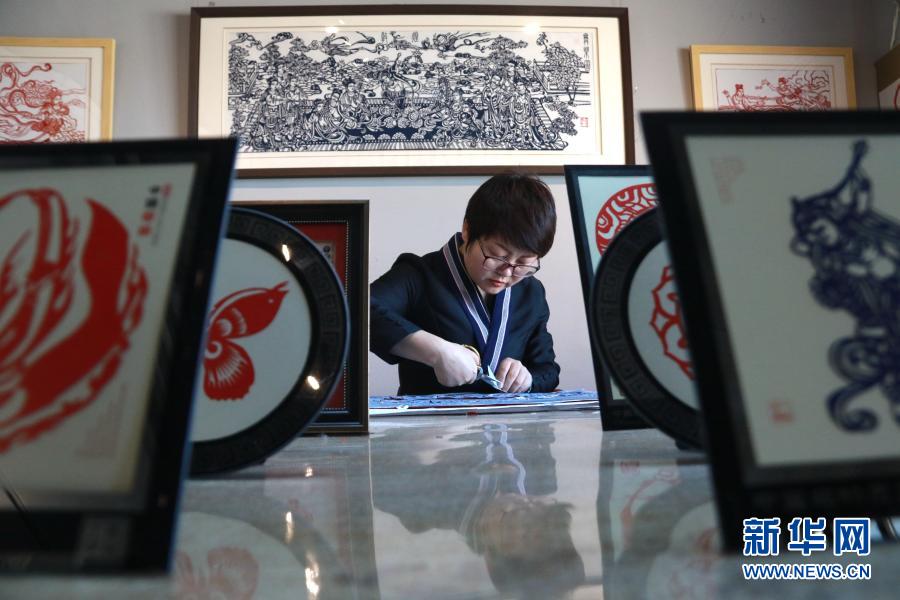 在甘肅敦煌小鎮(zhèn)鳴沙書院,“敦煌剪紙”酒泉市級(jí)非物質(zhì)文化遺產(chǎn)代表性傳承人莊生娟在自己的工作室內(nèi)創(chuàng)作(2020年12月31日攝)。新華社發(fā)(張曉亮 攝)