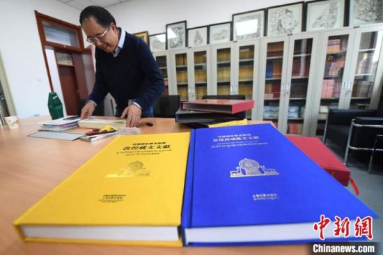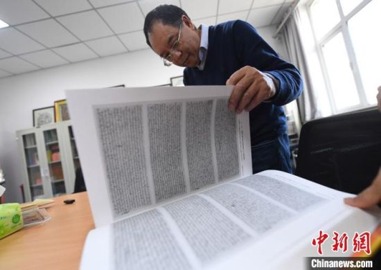 歷經(jīng)15年編纂,由法國(guó)國(guó)家圖書館與中國(guó)西北民族大學(xué)、上海古籍出版社合作編纂的《法國(guó)國(guó)家圖書館藏敦煌藏文文獻(xiàn)》,日前首次全部整理出版,才讓先后任副主編、主編?!钇G敏 攝