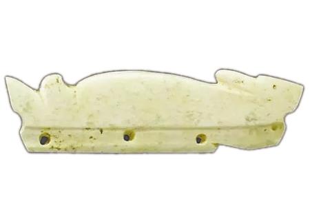 目前所見最早的玉兔有安徽含山凌家灘遺址出土的兔形飾件,其屬于凌家灘文化,距今5300年。該玉料受沁呈黃白色,飾件由兔形的上部和榫形的下部組成,兔呈伏臥狀,但無(wú)足部表現(xiàn),嘴前伸,耳朵向后伸,背部呈弧形上凸,尾巴既似兔子又若魚,上翹分叉;榫部長(zhǎng)條形,上面對(duì)鉆成四孔。