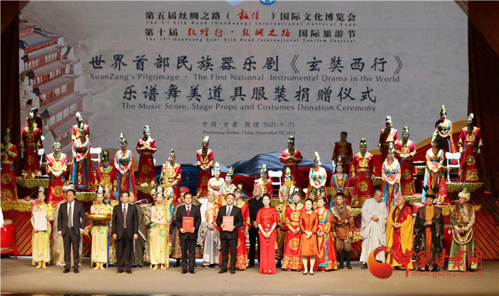 演出結(jié)束后,現(xiàn)場舉行了簡潔而隆重的“大型民族器樂劇《玄奘西行》樂譜舞美道具服裝捐贈儀式”,中央民族樂團將價值360萬元的樂譜、舞美、道具和服裝捐贈給甘肅演藝集團歌舞劇院,并指導(dǎo)甘肅省文藝院團將民族器樂劇《玄奘西行》打造成為弘揚絲路精神、推動絲路文化交流融合的經(jīng)典劇目。中央民族樂團作為海內(nèi)外規(guī)模最大、藝術(shù)最完備的綜合性國家級民族音樂表演團體,對甘肅文藝事業(yè)和地方樂團創(chuàng)作發(fā)展和人才培養(yǎng)給予大力支持,為甘肅文藝事業(yè)發(fā)展做出了重大貢獻。
