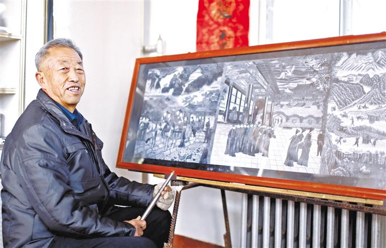 接下來就是耗費(fèi)工時與體力的制作過程,“每天創(chuàng)作雕刻都在三四個小時,每分鐘在刻板的敲擊次數(shù)達(dá)到近200次,每小時敲擊次數(shù)達(dá)到8000-12000次,9大板塊在創(chuàng)作過程中就要敲擊近16億次點,每個板塊耗時10-11個月,9大板塊共耗時3000多天。”陶世清細(xì)數(shù)著創(chuàng)作的艱辛。