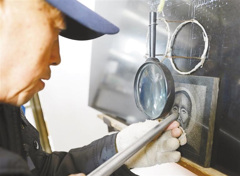 在大理石板上雕刻,是傳統(tǒng)手工技藝影雕的一種。這種雕刻方式采用墨玉、山西黑等純色石材,經(jīng)過水磨拋光后,在磨光面上要把雕琢的圖像輪廓描繪出來,根據(jù)黑白明暗成像原理,用特制的像針一樣細(xì)小的合金鋼頭工具,通過運(yùn)用腕力調(diào)節(jié)針點疏密粗細(xì)、深淺和虛實線變化而表現(xiàn)圖像。