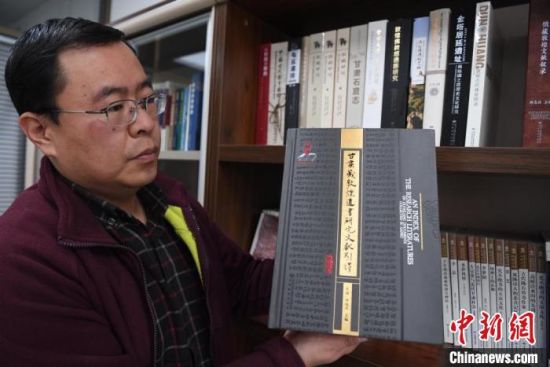 12月31日,甘肅教育出版社副社長(zhǎng)白鑫展示近期出版發(fā)行的《甘肅藏敦煌遺書(shū)研究文獻(xiàn)引得》。 楊艷敏 攝