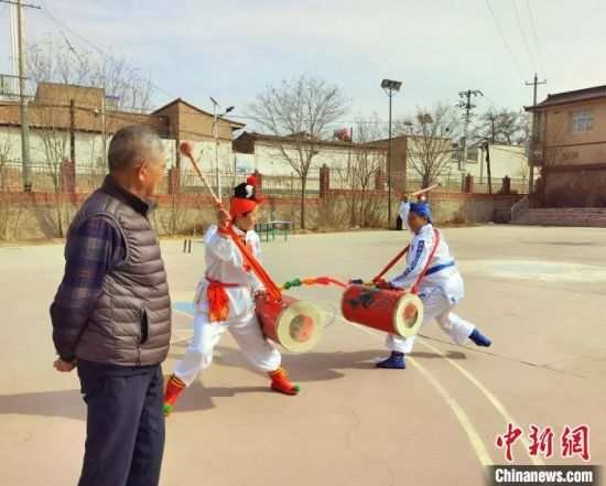 春寒料峭,中新網(wǎng)記者走進(jìn)蘭州市榆中縣金崖鎮(zhèn)陸家崖村,帶隊女子太平鼓隊近30年的陸鵬飛指導(dǎo)隊員訓(xùn)練?!堟骸z