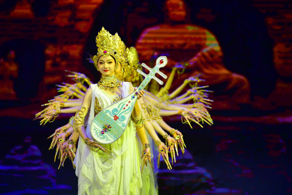 2021年9月24日,第五屆絲綢之路(敦煌)國際文化博覽會和第十屆敦煌行·絲綢之路國際旅游節(jié)在甘肅省敦煌市開幕。圖片為演員在開幕式上演出。新華社記者陳斌 攝