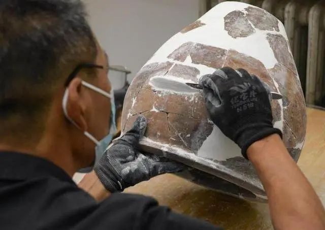 文物工作者對(duì)南佐遺址內(nèi)出土的陶器進(jìn)行修復(fù)(8月25日攝)。新華社記者 李賀