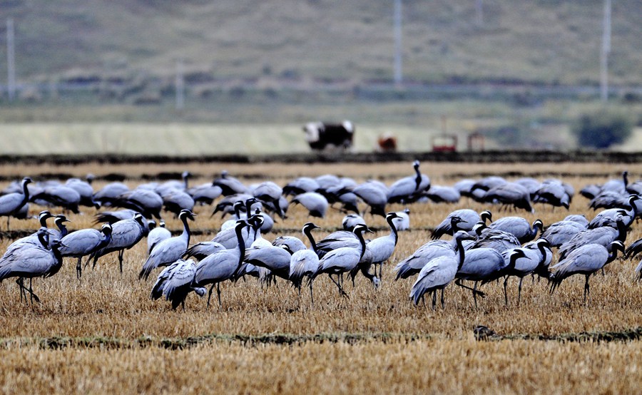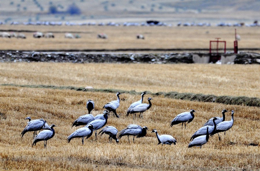 人民網(wǎng)蘭州10月10日電 (記者高翔)寒露至、候鳥遷,甘肅省肅南裕固族自治縣皇城鎮(zhèn)夏日塔拉草原迎來數(shù)千只蓑羽鶴,它們?cè)跐竦氐乃嫔稀⒉輩仓谢蛴崎e覓食、或蹁躚起舞,與色彩斑斕的草原構(gòu)成了一幅和諧優(yōu)美的生態(tài)畫卷。