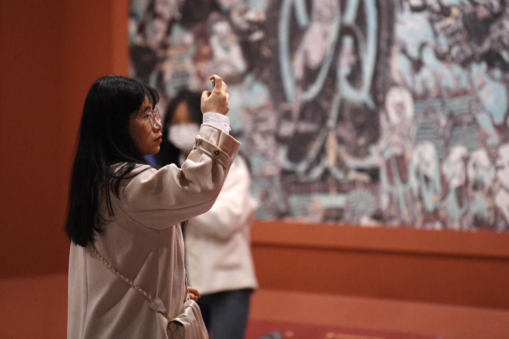 當日是清明節(jié)假期,眾多市民和游客來到位于蘭州黃河岸邊的敦煌研究院蘭州分院敦煌藝術(shù)館參觀“打卡”,欣賞“覺色敦煌 莫高精神”敦煌石窟藝術(shù)展,近距離感受敦煌文化藝術(shù)的魅力。