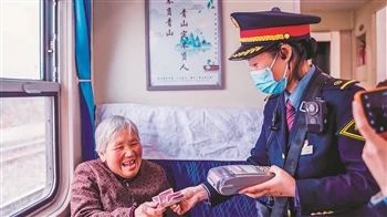 7505/7506次列車長在途中為老年旅客辦理現(xiàn)金補票業(yè)務(wù)。強 科 攝