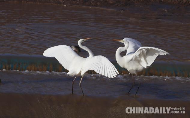 1月15日,數(shù)十只潔白的白鷺飛臨甘肅崇信城段的汭河,它們在此集結(jié)安家。