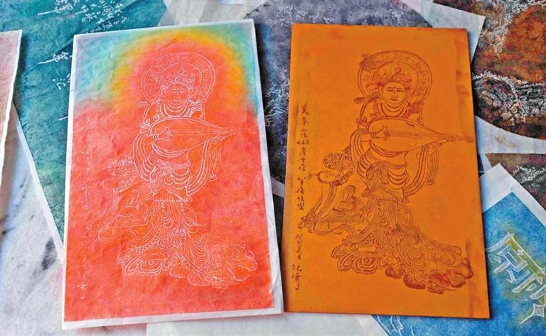 為了突出敦煌色彩,阮琦一改傳拓以墨為色的特點(diǎn),改用中國(guó)畫(huà)的顏料,讓一幅幅傳拓畫(huà)更能彰顯敦煌壁畫(huà)里的色彩之美。