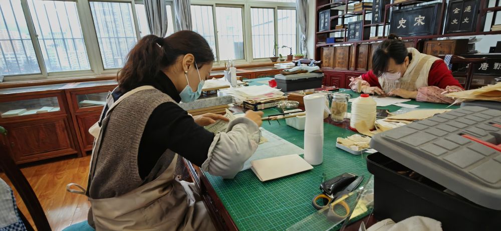 姚嘉迪和同事們正在修復(fù)古籍。新華社記者 文靜 攝