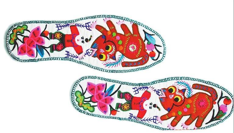 北方黃土高原,陜甘寧晉一帶,采用這種藝術(shù)縫制刺繡的衣物飾品有拼布藝術(shù)的鮮明特征,具有浮雕效果。其具體做法是將貼填繡畫相結(jié)合,有人叫做拼貼浮雕繡,在肚兜、枕頂?shù)鹊闹谱髦羞@種技藝采用最多。因?yàn)槎嗍钦w設(shè)計(jì),分部件制作,然后組合成一個(gè)完整的畫面在布上,所以叫“逗”,“逗”是秦隴方言,就是手指把不同部件小心拼合在一起組成圖案的動(dòng)作,因?yàn)椴计?,要小心仔?xì),輕輕拼合,所以會(huì)“逗裹兜”“逗夾襖”的媳婦,就是心靈手巧的人,說一個(gè)女性會(huì)“逗”,就是對(duì)她的女紅技藝的認(rèn)可。