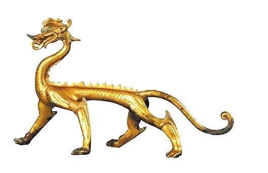 河南偃師的二里頭遺址出土了夏代龍文物,說明此時龍已經(jīng)成為身份、地位的象征。商代開始,龍的突出特征便是有了角,并多以夔龍紋等形象出現(xiàn)在青銅器上。春秋戰(zhàn)國時代是一個大變革、大發(fā)展的時代。與政治上諸侯爭雄、思想界百家爭鳴、陰陽學說盛行相適應(yīng),龍的圖案中出現(xiàn)了“群龍”和“交龍”形象。如甘肅省博物館收藏的戰(zhàn)國盤龍紋金飾片,兩條龍交叉盤繞,龍首一側(cè)飾兩條小龍,龍尾一側(cè)飾一對小虎,作咬噬龍尾狀,龍身上飾聯(lián)珠紋。隨著華夏大地結(jié)束戰(zhàn)亂,走向一統(tǒng),秦漢時代的龍出現(xiàn)相對規(guī)范和定型的趨勢,并出現(xiàn)了背上長翅膀的龍。魏晉南北朝時期龍形象對內(nèi)融合各少數(shù)民族文化,對外融合佛教文化,流行的龍紋頭部扁長,角似鹿角,發(fā)鬣后披,挺胸奮肢,呈現(xiàn)出矯健奔放、線條流暢、氣韻生動的特點。
