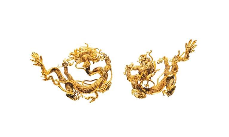 甘肅省博物館藏的明代累絲金龍,龍首聳額巨目,鬣發(fā)飛揚,神情兇猛;龍足屈伸相應(yīng),利爪如鉤;龍身似盤似舒,蜿蜒多態(tài);龍尾分叉,形狀如葉,輕輕擺動,飄帶般長須刻畫出金龍瀟灑自由的雄姿。