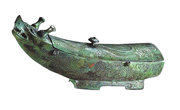陜西寶雞出土的逨盉,酷似現(xiàn)代的扁圓形壺,器身呈扁圓形,長(zhǎng)方形口上有鳳鳥形蓋。鳳鳥引首高昂,喙微卷曲,振翼欲飛。器身與蓋用虎形鏈及雙環(huán)相連,虎作向上爬行狀,頭左偏而尾上卷。直管狀流,流端作龍首狀。鋬呈龍首向下噴水狀,下有四獸足。腹部?jī)蓚?cè)紋飾相同,分別由三圈組成,由外向內(nèi)依次為變體夔龍紋、重環(huán)紋和蟠龍紋。逨盉是祭祀禮器,它將天上飛的鳳鳥、地上跑的猛虎、水里游的蛟龍,作為溝通天地、人神的使者,使天地人三者合而為一。由于周人將動(dòng)物視為具有無限神力之神靈,因此青銅器上之動(dòng)物紋樣,除宗教祭祀意涵外,也富有一定的政治意義。貴族通過青銅器上神秘肅穆的動(dòng)物紋樣,令人望之崇敬生畏,以威嚇被統(tǒng)治者,達(dá)到鞏固本身地位及權(quán)威之目的,同時(shí)也含有龍騰虎躍鳳呈祥的美好寓意。