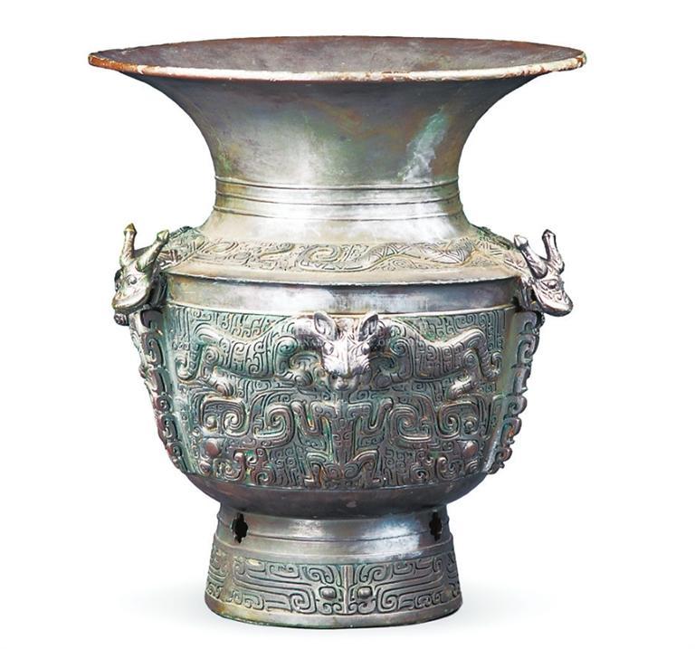 中國國家博物館收藏的龍虎紋青銅尊,高50.5厘米,重26.2千克,為一件體形較高大的盛酒器。青銅尊肩部以圓雕和浮雕相結(jié)合,塑造3條生動(dòng)的蟠龍形象,龍身蜿蜒,龍首探出,額有雙角,闊吻巨口,兩眼大睜。腹部紋飾為一個(gè)虎頭兩個(gè)虎身,虎口之下有一人形,人頭銜于虎口之中?;⑸硐路揭造槔鉃榻?,飾兩夔龍相對(duì)組成的獸面。從主體花紋看,龍、虎、人造型莊嚴(yán)穩(wěn)重、奇特神秘,特別是龍頭和虎頭用澆鑄法從外壁突兀凸起,雄健粗獷,比起用高浮雕法更具有一種威武逼人的悍氣。龍虎尊圓形大口表示上天,肩部神龍游蕩于空中;猛虎張牙舞爪守護(hù)大地。龍虎尊的鑄造采用十八塊母范經(jīng)兩次焊接而成,渾然一體,毫無痕跡。整器工藝精湛,花紋線條洗練,是商代青銅器中的精品。