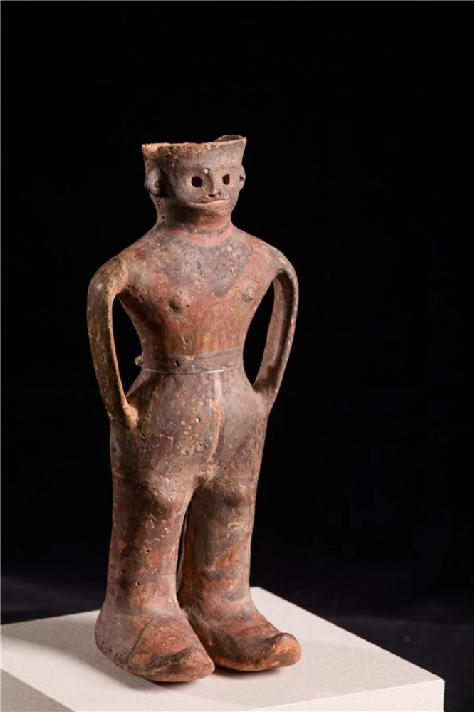 “河西少年”——人形彩陶罐出土于火燒溝遺址,國(guó)家一級(jí)珍貴文物, 1990年作為甘肅省選送的8件精品文物之一在舉辦第十一屆北京亞運(yùn)會(huì)期間向中外游客展出。遠(yuǎn)看是一名雙手插兜站立的酷少年,其體 態(tài)、動(dòng)作和神情刻畫(huà)得栩栩如生;走近一看,人像短發(fā)、高鼻深目、雙耳開(kāi)孔、表情生動(dòng),其身 著短上衣,頸部至胸前的網(wǎng)格紋就像是戴有精美的項(xiàng)飾,下身著網(wǎng)格長(zhǎng)褲裙,雙手插在褲兜里, 碩大的雙腳上穿著肥大的高腰靴子,一副怡然自得的樣子。陶罐人體中空,可以盛水, 插入褲兜的雙臂形成陶罐的雙耳,設(shè)計(jì)大膽,制作精巧。2023年玉門(mén)市博物館參加的騰訊探元文化創(chuàng)新大賽“古物換新樣”中,“河西少年”成為追捧的對(duì)象,在眾多參賽作品中脫穎而出,被很多設(shè)計(jì)師設(shè)計(jì)成了背包、花盆、臺(tái)燈、盲盒等文創(chuàng)產(chǎn)品。