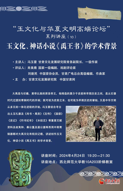 4月24日晚,馮玉雷講座“玉文化、神話小說《禹王書》的學(xué)術(shù)背景”在西北師范大學(xué)舉辦。這次講座是甘肅文化發(fā)展研究院和中國甘肅網(wǎng)聯(lián)合舉辦的“玉文化玉華夏文明高端論壇”系列講座第十講,也是近期啟動的“巡禮馬銜山:玉文化與文學(xué)融合發(fā)展”系列活動之一,甘肅文化發(fā)展研究院常務(wù)副院長、一級作家馮玉雷主講,國家一級編劇、戲劇評論家肖美鹿,中國音協(xié)會員、甘肅廣電總臺高級編輯、作曲家劉新民擔(dān)綱學(xué)術(shù)評議嘉賓。