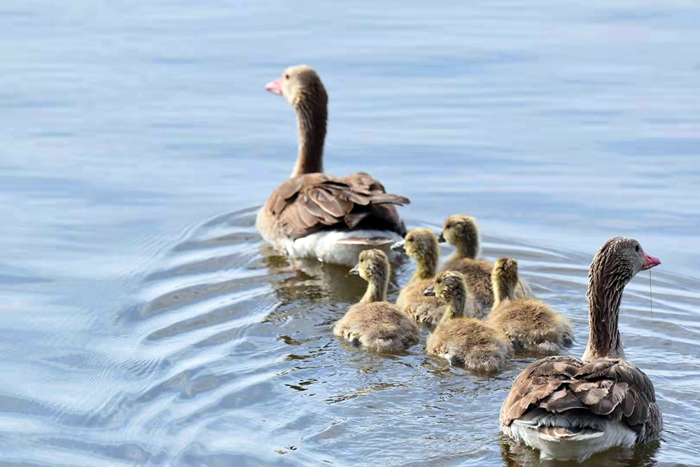 灰雁是鴨科雁屬鳥類,屬國家重點保護的“三有”鳥類,也是陽關濕地的夏候鳥。監(jiān)測顯示,在陽關濕地繁殖的灰雁家族有100多只。每年3月下旬遷飛至陽關濕地,4月中旬筑巢繁殖,5月上旬孵化出雛鳥4至5只?;已銥?ldquo;一夫一妻”制,孵化由雌鳥單獨承擔,雄鳥在巢附近負責警戒。待雛鳥破殼出窩后,則由雌雄共同撫育?;已闵阅懶?、機警,小寶寶溜達時,雌鳥在前開道,雄鳥負責斷后,小寶寶上岸覓食嫩草芽時,雄鳥仍然負責警戒,若有危險立刻鳴叫警示。故而,近距離拍攝灰雁雛鳥是比較困難的。