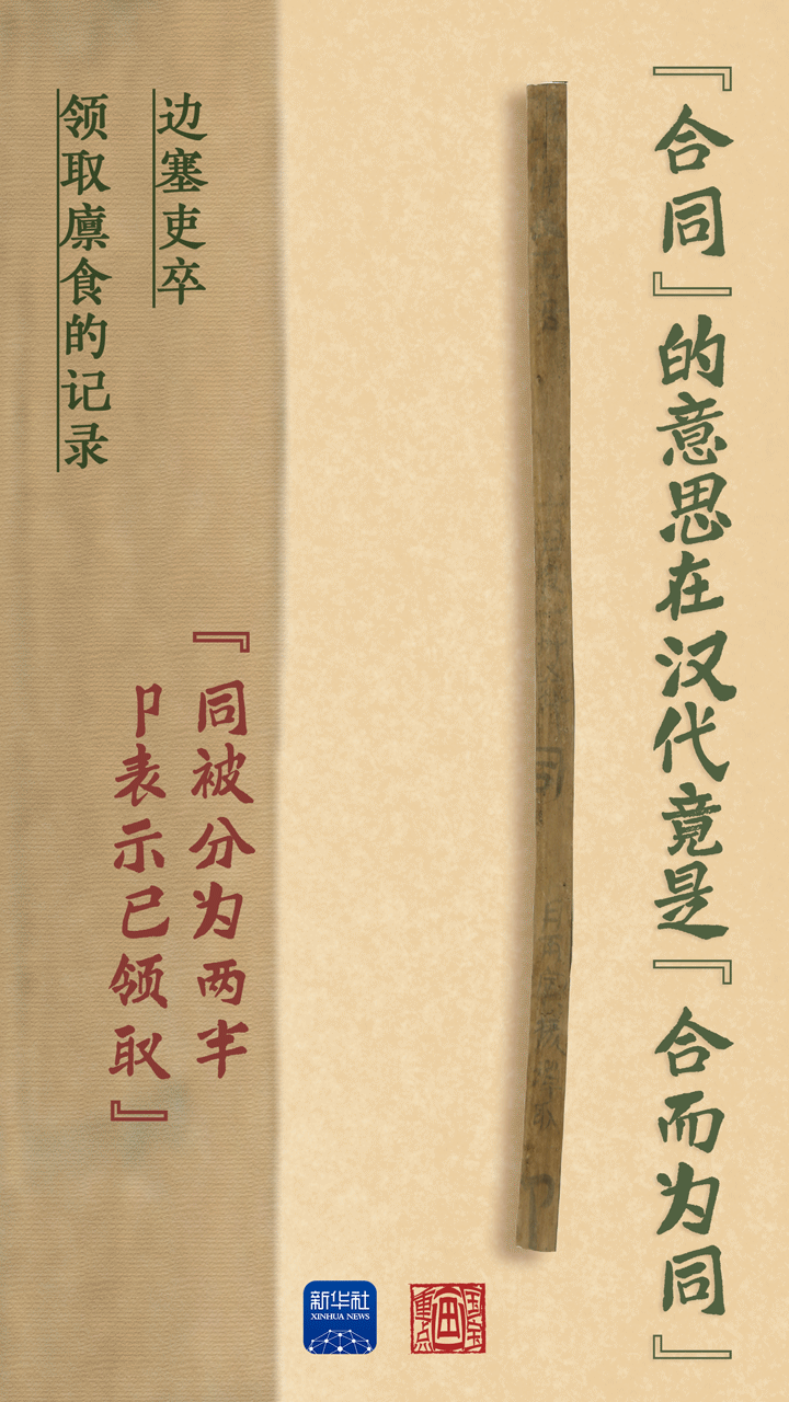 漢代人在簡牘上書寫一個“同”字,從中間一分為二,由雙方當事人各執(zhí)一半。需要核驗時,雙方將所執(zhí)半簡合在一起,這樣就能拼成一個完整的“同”字?;蛟S,這就是現(xiàn)代“合同”的來歷。