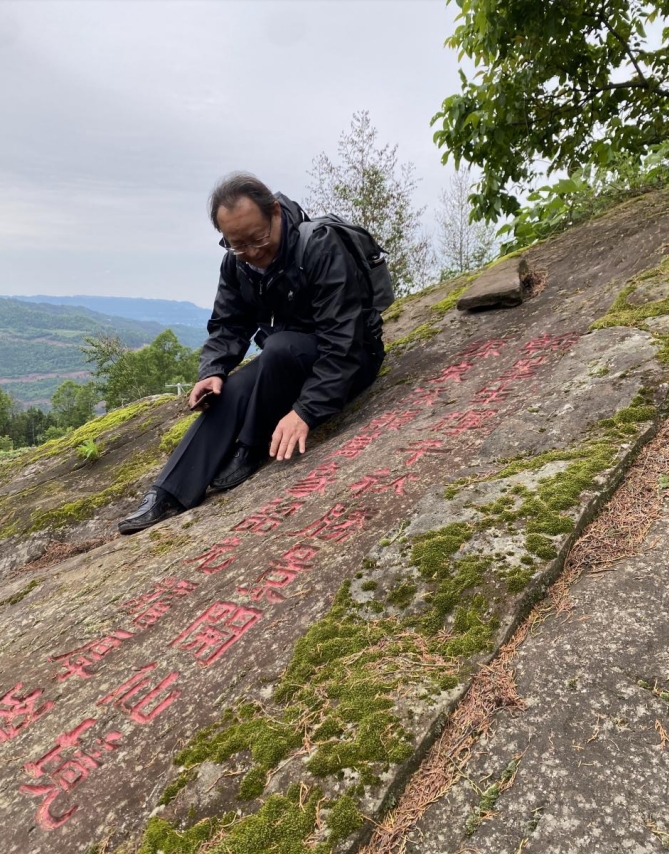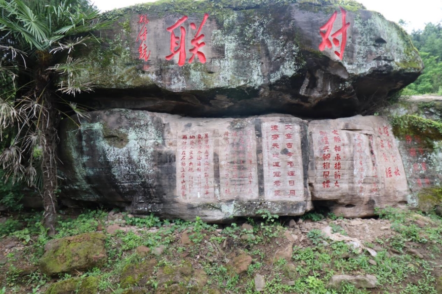 山上隨處是石,或臥或立,俱有雄獅虎豹之勢(shì);或平或峻,皆作岡陵之態(tài)。青峰續(xù)脈,絕頂鷹飛。鑿巖壁以造法像,栩栩如臨宮闕;摩巨石而鐫嘉聯(lián),文華直射牛斗。石多瑰偉,苔覆璞瑜,油菜花點(diǎn)綴其間,引來(lái)蜜蜂蝴蝶共舞。山茶與毛竹同畦,郁郁蔥蔥;峰巒與云煙共養(yǎng),莽莽蒼蒼。遇目石上鐫字,瀏賞翰墨煙霞;振藻揚(yáng)毫,皆寰中俊杰;椽筆斯文,多隴蜀賢達(dá)?;虺嘧痈文?,燭照于史;或凜然浩氣,嘯傲大千。聯(lián)壁生輝,文曲星彰;峣巖開(kāi)竅,氣通神明。文采煥然與星河同輝,詩(shī)儕競(jìng)秀潤(rùn)厚山玉顏。壯懷詩(shī)夢(mèng),漱玉溪流。在一塊巨石斜面上,有同伴發(fā)現(xiàn)刻有筆者所書長(zhǎng)聯(lián),興奮得喊叫起來(lái)。這是三年前應(yīng)曹興章先生之約而作,聯(lián)曰:翰墨生輝,千秋勝景開(kāi)仙境;源泉流韻,萬(wàn)象韶光耀厚山。我用手指扣去筆畫生出的茂密青苔,坐下來(lái)與我的聯(lián)合影留念。信是蓮花開(kāi)石上,遙遙至此結(jié)仙緣。