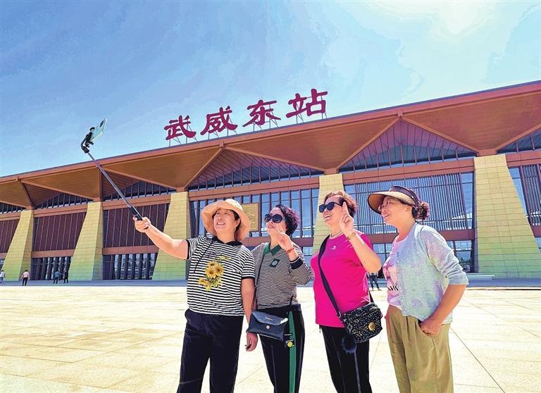 市民在武威東站廣場拍照打卡。