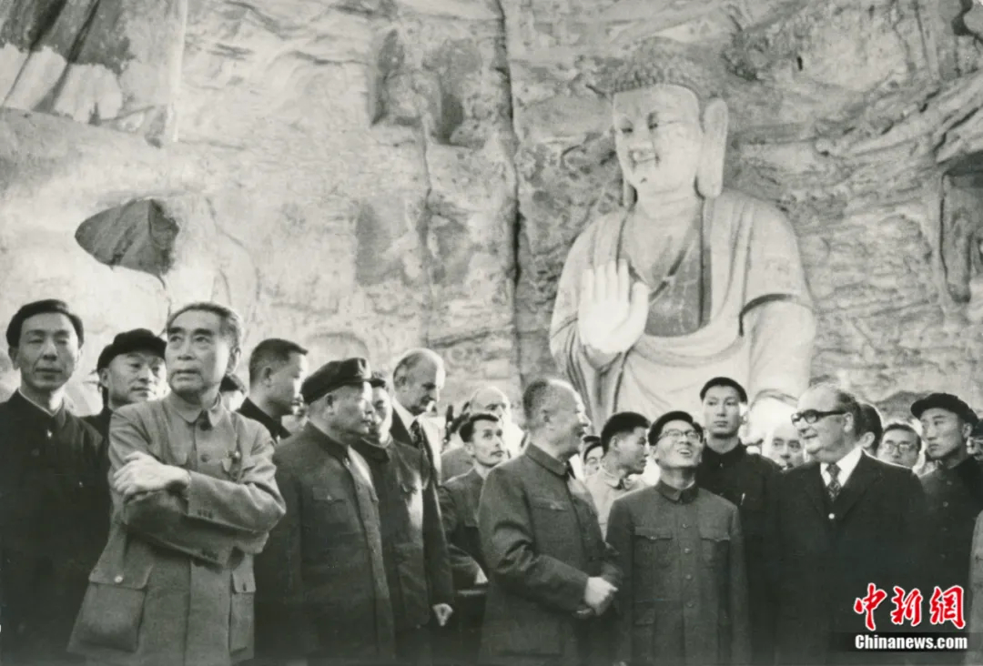 1973年9月15日,周恩來總理陪同時(shí)任法國(guó)總統(tǒng)喬治·蓬皮杜視察云岡石窟。云岡研究院 供圖