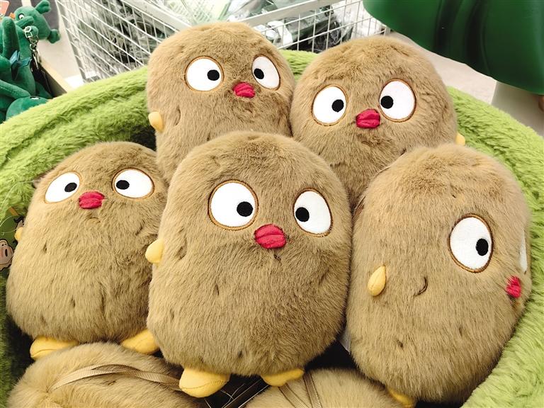 此時(shí),目不暇接的花式文創(chuàng)在店內(nèi)“爭(zhēng)奇斗艷”,爭(zhēng)當(dāng)“顯眼包”,等待被主人帶回家。掀開店內(nèi)一只毛絨收納箱,一窩土豆子撲閃著大眼睛向你眨眼。都說(shuō)轉(zhuǎn)角遇到愛,誰(shuí)料,轉(zhuǎn)角處粉嘟嘟的“拿捏玩偶娃娃公仔”捏著一個(gè)小蓮花花苞在向你招手。一回頭,造型別致的文創(chuàng)飾品精美又時(shí)尚,一側(cè)的帆布包上印著“別卷我”。就連記者逛下來(lái),都入手兩件文創(chuàng)。