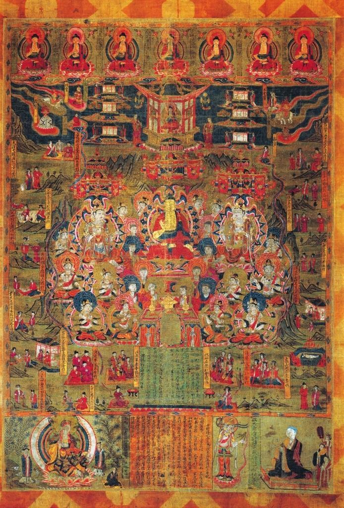 該畫為絹地設(shè)色,出自敦煌莫高窟藏經(jīng)洞。畫面中心為說法圖,一佛二菩薩法相莊嚴(yán),諸菩薩、弟子、比丘、比丘尼、優(yōu)婆塞、優(yōu)婆夷等“赴會(huì)圣眾”圍繞周圍。兩側(cè)及上方分布15幅經(jīng)變故事圖,以連環(huán)畫形式鋪陳展現(xiàn)《佛說父母恩重經(jīng)》的基本內(nèi)容。其上繪七佛、彌勒與七寶,其下墨書《佛說報(bào)父母恩重經(jīng)變》。絹畫最下方自左向右排布地藏菩薩、《繪佛邈真紀(jì)》、引路菩薩及比丘尼戒行邈真像。該絹畫保存完整,色彩絢麗,是敦煌《佛說父母恩重經(jīng)》諸變相中,內(nèi)容最復(fù)雜,畫面情節(jié)最多,特點(diǎn)最鮮明,風(fēng)格最獨(dú)特的一幅,且有宋淳化二年(公元991年)明確紀(jì)年,具有重要的歷史、藝術(shù)和研究價(jià)值。