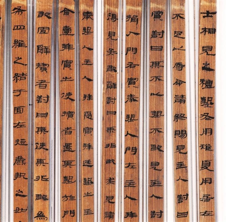 《儀禮》簡,西漢,武威磨嘴子出土。分木質(zhì)和竹質(zhì)兩種,共496枚,編為甲、乙、丙三本,系先編后寫。甲本為《儀禮》17篇中的7篇,乙本僅存《服傳》一篇,丙本僅存《喪服》一篇。該簡冊保存基本完好,與傳世的鄭玄注本不同,應(yīng)是目前所見《儀禮》的最古寫本,在版本??鄙嫌泻芨叩膬r(jià)值,且書寫工整秀麗,是漢代墨寫隸書的上品。
