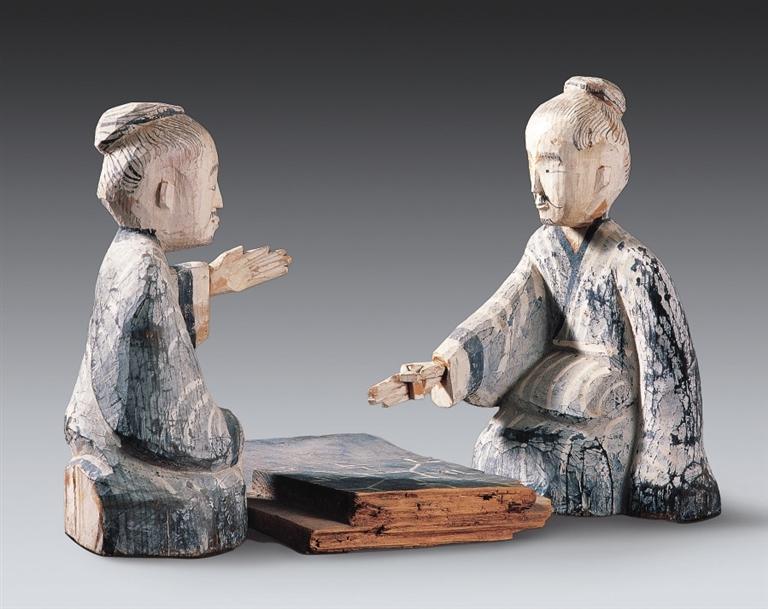 彩繪木六博俑,西漢,武威磨嘴子出土。木俑為兩位跪坐對局的老者形象,二者間設(shè)一長方形棋盤。老者神情凝滯,蓄勢待發(fā),顯然正在緊張的六博對局之中。考古發(fā)現(xiàn)中不乏漢代博局、棋子、骰子等六博器具,漢墓畫像磚中也常見相關(guān)圖像,但以雕塑刻畫六博對局卻極為罕見,這件文物充分體現(xiàn)了漢代木雕藝術(shù)所達(dá)到的高度與境界。