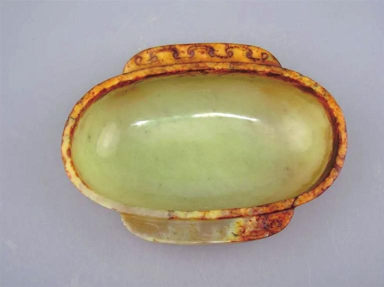 羽觴,多美妙風(fēng)雅的名稱,它的基本形制是扁橢圓,弧形壁,淺腹平底,餅形足或高足,口緣兩側(cè)各有一個(gè)半月形耳或方形耳。這種形制始于春秋戰(zhàn)國,是由橢杯、舟等演變而來,盛行于秦漢至魏晉南北朝,唐代以后便很少見到。其材質(zhì)有漆木、青銅、金、銀、玉、陶等,其中玉耳杯由諸侯王、列侯等身份地位比較高的人使用,漆耳杯使用者范圍較廣泛,上至帝王諸侯,下至一般貴族均可使用。