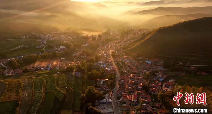 8月14日晚,蘭州市榆中縣馬坡鄉(xiāng),夕陽在云海里翻滾,映照大地和村莊城鎮(zhèn),美不勝收。圖為日落映照城鎮(zhèn)。牛遠明 攝