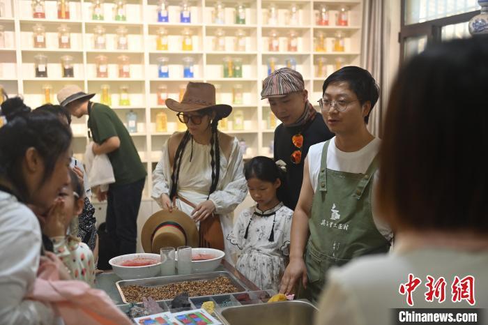 8月20日,甘肅敦煌莫高里工匠村內(nèi),研學導師向?qū)W員介紹敦煌礦物質(zhì)顏料。工匠村開設了泥板畫、彩繪、雕塑制作、剪紙、農(nóng)耕體驗等課程,現(xiàn)已發(fā)展成為一個集敦煌文化講堂、壁畫書法研習、美術設計、彩塑制作教學、篆刻藝術、傳統(tǒng)釀酒體驗、農(nóng)業(yè)產(chǎn)業(yè)發(fā)展等于一體的多功能實訓基地。中新社記者 李亞龍 攝