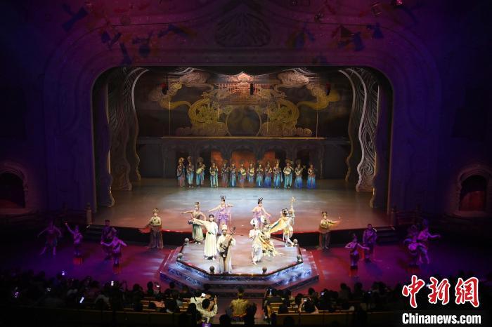 9月5日晚,甘肅敦煌旅游熱度不減,眾多游客觀看大型洞窟式沉浸體驗劇《樂動敦煌》。該劇溯源敦煌文化,借助對莫高窟壁畫、藏經(jīng)洞古籍進行解讀,用全息投影、3D威亞等高科技手段,以全沉浸式的呈現(xiàn)方式,演繹西域少年追尋藝術(shù)的傳奇故事。劇中運用了琵琶、排簫、阮等民族樂器及仿制敦煌古樂器的音色,通過胡旋舞、腰鼓舞、琵琶舞等典型舞蹈,展現(xiàn)了敦煌壁畫中的樂舞盛景,全面展現(xiàn)敦煌傳承千年的樂舞文化魅力。九美旦增 攝