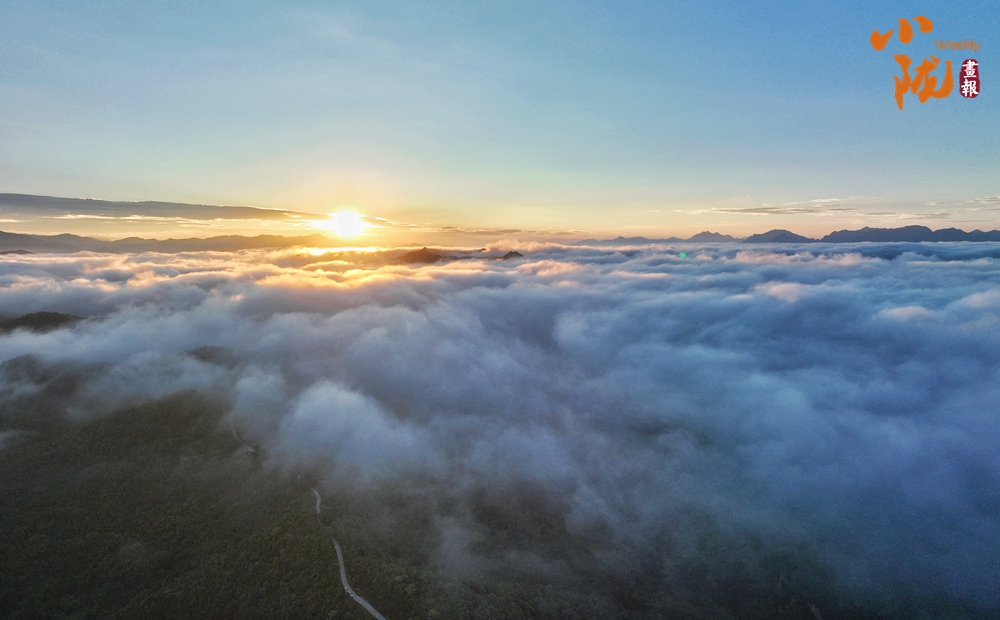重山峻嶺間,白云如棉花般柔軟,遠(yuǎn)處的群峰在朝陽(yáng)映照和云霧的烘托下,勾勒出一幅綠色畫卷。