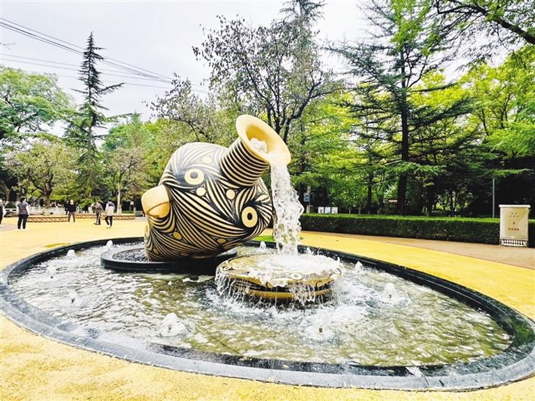 走進公園(東口),入口處以“大河厚土孕彩陶”為主題的彩陶墻格外顯眼,墻上鑲嵌著不同造型和樣式的彩陶,分別介紹了大地灣文化彩陶、仰韶文化彩陶、馬家窯文化彩陶、齊家文化彩陶四個不同歷史發(fā)展時期。沿健身步道向西行進,體量巨大的馬家窯旋紋彩陶尖底瓶正向旋紋彩陶盆內(nèi)倒入“黃河之水”,這一景觀便是“彩陶流水”節(jié)點,景觀造型采用跌水、涌泉的形式,打造出彩陶流水的動態(tài)效果,象征著黃河文化的源遠(yuǎn)流長。