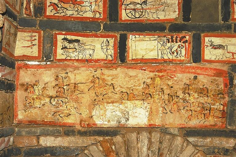 魏晉十六國(guó)磚畫(huà)在墓中的布局、組合,體現(xiàn)出 “滿”和“層”的特點(diǎn)。整個(gè)墓室,各方位、各邊角以及過(guò)道均鑲砌畫(huà)磚。以嘉峪關(guān)果園—新城5號(hào)墓畫(huà)磚的布局為例,各層間隔、同層緊鄰的畫(huà)磚,給觀者的感覺(jué)就是整幅壁畫(huà),但每一塊又是一個(gè)獨(dú)立的畫(huà)面,這種“樣式”,是魏晉十六國(guó)時(shí)期的河西匠工、畫(huà)工,在繼承漢晉磚室墓的同時(shí),將畫(huà)像磚在墓室布局的方式也加以接受。艷麗的色彩,“忠實(shí)”生活的寫(xiě)實(shí)手法,又是河西畫(huà)匠們的創(chuàng)新和發(fā)揮。