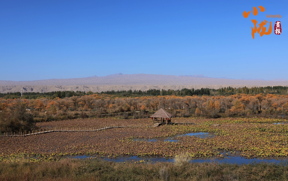 一大片荷花池,因?yàn)槭巧钋铮貎?nèi)的荷葉已經(jīng)枯萎,變成金黃色,與周邊的金胡楊相映成趣。蒼勁的胡楊,高雅的荷花在此結(jié)緣。葦草繁茂,野花盛開(kāi),置身其中,仿佛走進(jìn)金色的海洋。