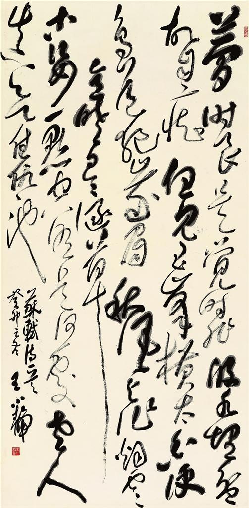 隴南有著得天獨(dú)厚的碑學(xué)資源,以《西狹頌》為代表的碑刻見(jiàn)證了隴南金石碑學(xué)的延續(xù)。王小靜書法中的篆隸素養(yǎng)即來(lái)自于此,她大量臨習(xí)金文、漢碑,取其古拙之趣,將碑學(xué)強(qiáng)調(diào)的線條運(yùn)用在草書中,涵養(yǎng)了草書的內(nèi)韻,在澎湃開張的草書體態(tài)中顯示出了厚重的體積感和塊面感,一張一弛之間將一種真正源于內(nèi)心對(duì)草書的熱愛(ài)凝結(jié)于紙面。從內(nèi)心情感對(duì)草書的萌動(dòng)到草書創(chuàng)作進(jìn)入自由抒情階段,這是一次漫長(zhǎng)的學(xué)習(xí)之旅。王小靜一直在這條路上奮進(jìn),至今仍然堅(jiān)持臨摹古代經(jīng)典,尤其注重把對(duì)篆隸的臨摹推向深入。她認(rèn)為,不斷深入古代經(jīng)典,從傳統(tǒng)中尋找個(gè)人的創(chuàng)新空間,才是有價(jià)值的創(chuàng)新。