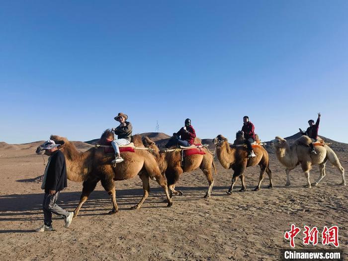 圖為留學(xué)生在陽關(guān)景區(qū)體驗(yàn)乘騎駱駝。劉玉桃 攝