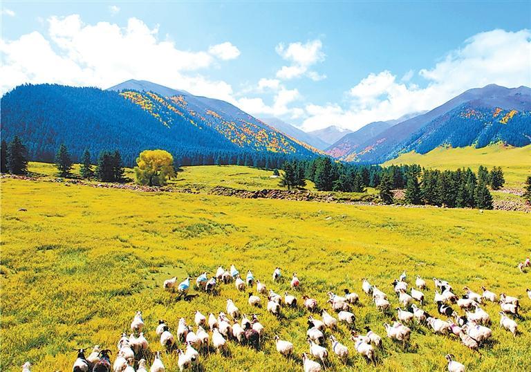 走進(jìn)景區(qū),映入眼簾的便是布爾智峽谷,其重巒疊嶂,造型奇特。進(jìn)入峽谷,豁然中開,地勢平坦,視野開闊,形成五山匯集的盆地景觀,一條悠悠的小河穿過盆地的胸膛,明亮清澈。遠(yuǎn)山白雪皚皚,山腰云杉參天,山下灌木叢生,蒼翠蔥郁,山底蒼蒼茫茫的草原上,不時涌動著潔白的羊群。徜徉于廣袤的草原,便真正體味到“鳥的世界,花的海洋”的博大內(nèi)涵。