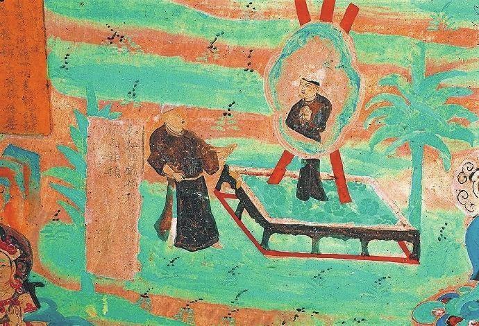 戰(zhàn)國時(shí)期楚國詩人屈原在《漁父》一文中寫道:“吾聞之,新沐者必彈冠,新浴者必振衣。安能以身之察察,受物之汶汶者乎?”意思是說我聽說剛洗過頭的人一定會去彈彈帽子上的灰塵;剛洗過澡的人一定要抖抖衣服的灰塵。怎能讓清白的身體去接觸世俗塵埃的污染呢?當(dāng)年的敦煌人走出溫泉,在身心放松之后,就該靜觀返照自己了。在莫高窟第85窟中有一幅“曲花式鏡圖”:畫面上在一個(gè)正方形鏤空的底座上擺放著一個(gè)巨大的曲花式鏡,鏡子式樣別致,明亮澄澈。藍(lán)色的曲花式樣引人矚目。但畫面上最吸睛的是一位魁梧俊朗身著一襲赭色長袍的男子,他正在鏡子前仔細(xì)地打量自己,而鏡中映射出他神情凝重的情態(tài)來。原來,古人照鏡除了正衣冠之外,還有反觀自照的含義,在鏡子前良久地注視自己,就是對自己反省、頓悟的過程。“一年好景君須記”,走過四季,到了歲末,該是每個(gè)人回望來時(shí)路,展望前方的時(shí)候了。